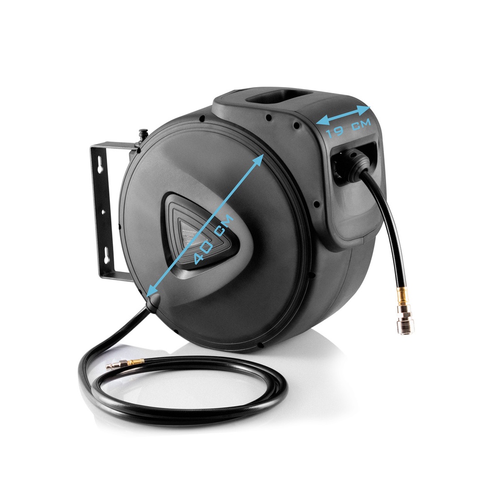 - Ein robustes Kunststoffgehäuse mit ergonomischer Handgriffmulde und leistungsstarker Aufrollautomatik mit Fliehkraftbremse sorgt für Ordnung am Arbeitsplatz und schützt den Druckluftschlauch vor Verschleiß und Beschädigungen. Mit der Arretier-Funktion lässt sich die gewünschte Länge des Schlauchs spielend leicht auswählen.