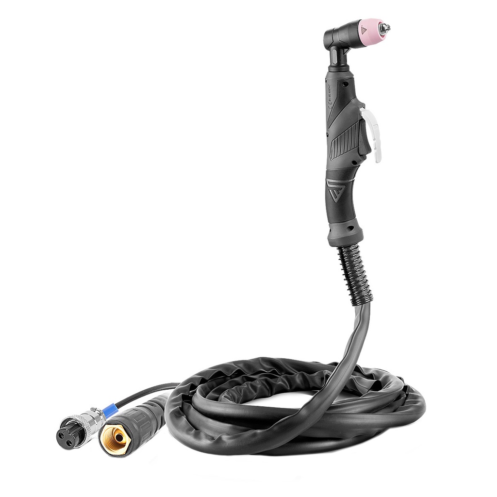Der luftgekühlte STAHLWERK Plasmabrenner vom Typ AG-60 ist mit einem luftgekühlten Schlauchpaket ausgerüstet und für eine Belastung bis 70 Ampere ausgelegt. Das 5 Meter Schlauchpaket verfügt über eine integrierte Masseverbindung. Dadurch entfällt ein zusätzlicher Verbindungsstecker, und der Schlauch ist robuster. Der Schaltkontakt für die Zündung wird über einen 2-poligen Verbindungstecker hergestellt. Der Plasmaschneidbrenner AG-60 /SG-55 liegt gut in der Hand und ermöglicht ein zeitlich längeres, ermüdungsarmes Schneiden. Dieses Schlauchpaket eignet sich für die folgenden Gerätekombinationen bzw. Brenner: WIG AC/DC 200 Puls Plasma/S-Serie, DC Kombigeräte CT-520 Plasma / S-Serie, CT-50 Puls Plasma / S-Serie, CT-535 Plasma / S-Serie, sowie mit dem Plasmaschneider CUT 40 S / -ST-Serie, CUT 50 / CUT 50 S- /-ST- Serie, CUT 55 / S-Serie/, CUT 60 / ST- Serie, CUT 70 / S-Serie (ohne Pilotzündung). Der Schaltkontakt für die Zündung wird über einen 2-poligen Verbindungsstecker hergestellt.